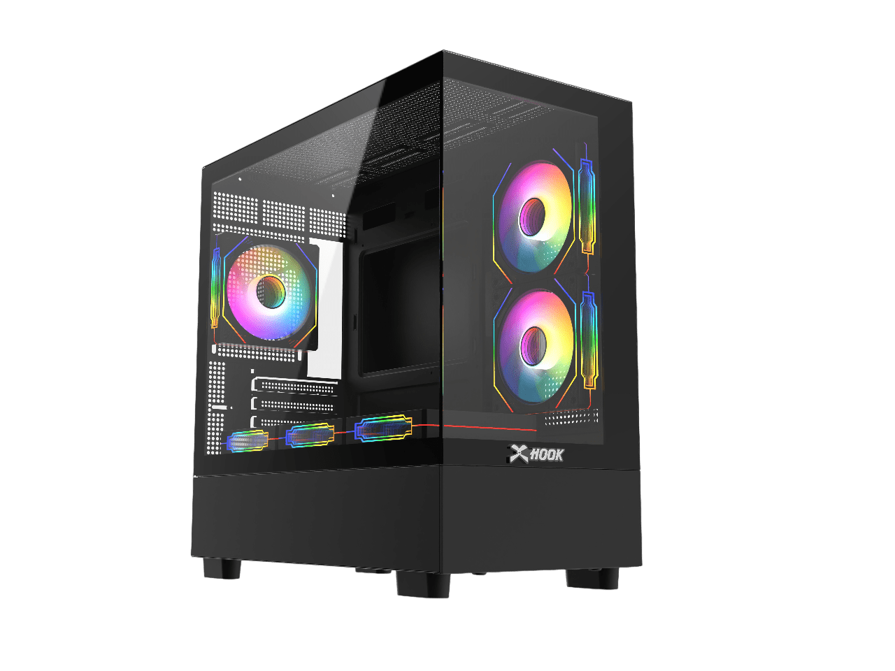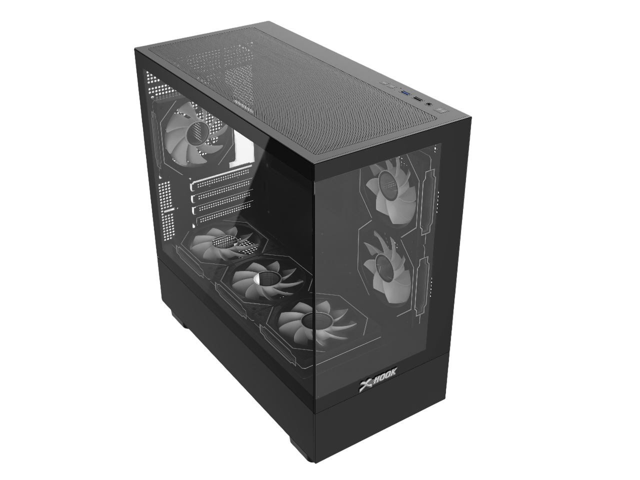 - اللوحة الجانبية اليسرى مصنوعة بالكامل من الزجاج المقوى: تعرض المكونات الداخلية والإضاءة.